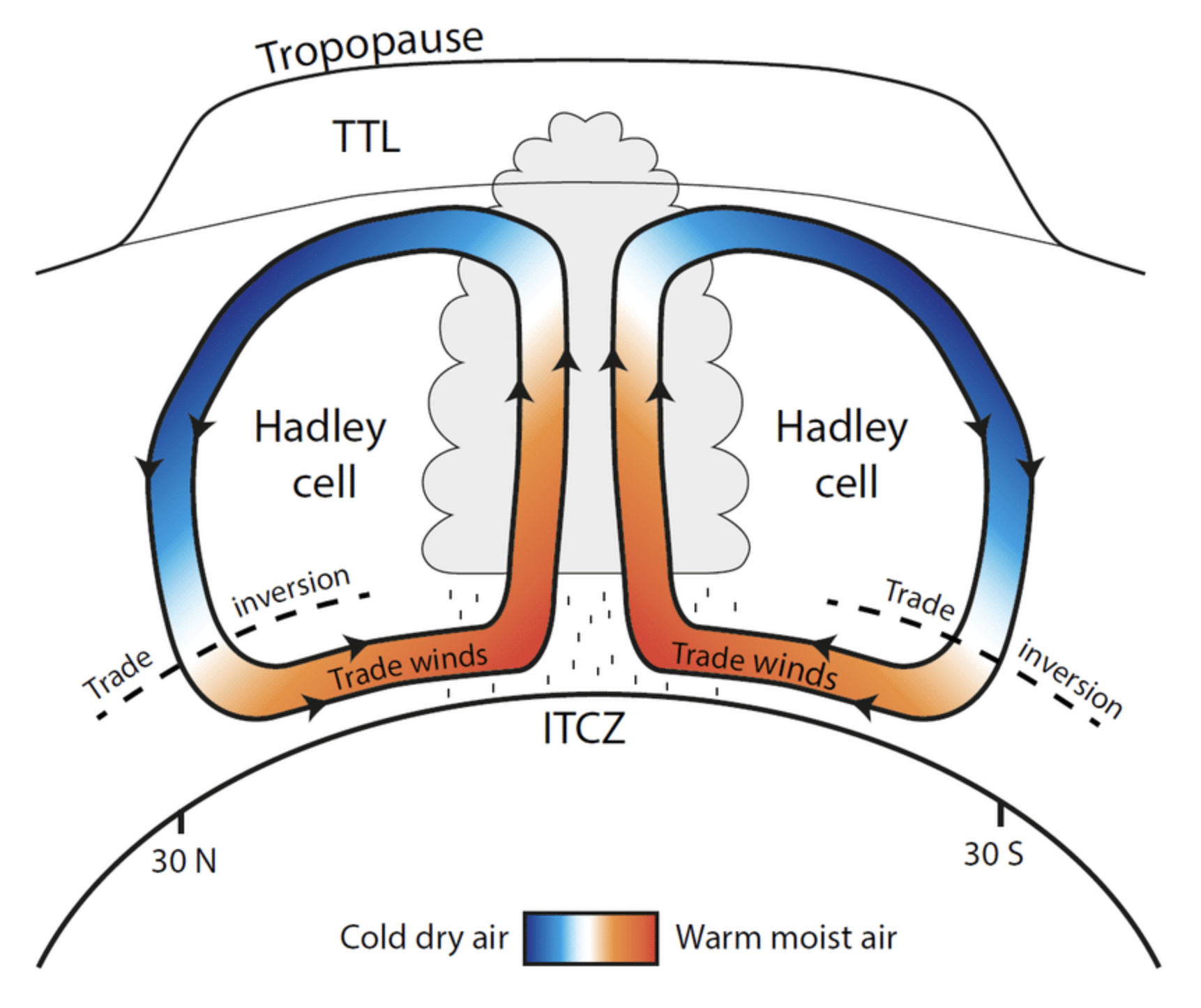 The strictly Cartesian definition of the tropics is not the same as the climatological one (Barry & Chorley, 2010). The poleward edges of the two Hadley Circulations or Cells – roughly between ≈30° N and ≈30° S – are more widely recognised as the average atmospheric boundary between the tropics and extra-tropics either side of the Equator (Figure 1). The Hadley Circulation is a global-scale tropical atmospheric circulation pattern characterised by rising moist air in low latitudes, poleward flow in the upper atmosphere, sinking dry air in the subtropics and equatorward flow at the surface. This thermally driven circulation is a significant component of Earth’s climate system, influencing global weather patterns and – importantly – the distribution of excess heat and moisture from the tropics to the extra-tropics (Barry & Chorley, 2010).