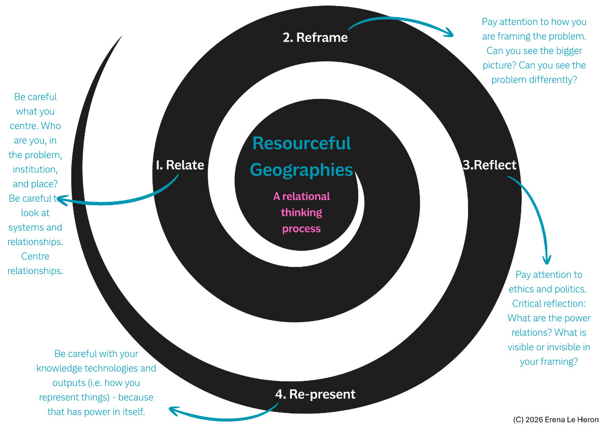 Figure 1 shows a stepped thinking process central to achieving a commitment to being resourceful. It assumes a willingness to delve deeply to build up learnings that will enable ‘doing a re-setting of personal geographical engagement’. It is directed towards gradually introducing discussion about different kinds of situated efforts. The strategy is procedural and evaluative, to help gather understandings about context, circumstance and resolve. While Figure 1 formalises the thinking process, it is intended more as a field of questions which if posed in different settings will aid robust discussion and personal development. The questions we raise at each step may seem strange. They suggest being cautious, honest and yet searching in encouraging explicit learning at each step. Unsurprisingly Relate is personally coming to terms with Geography’s new situation, one’s own situation, regrouping with colleagues and allies over concerns and hopeful directions. After this step we shift interest to how to put to work new-found awareness. Reframing is what might and can be done, with whom and under what terms. It is about what is manageable in institutional settings and their politics. We emphasise manageable because it signals hesitancy over pondering workable connections and indeterminacy inherent in conflicting choices and murky outcomes and associations. Reflect acknowledges tentative development of understanding which will almost inevitably be is subject to repeated critique from different perspectives and positioning of others. Re-present captures the momentum of outlining suggestive transitions involved in moving beyond a business-as-usual position.